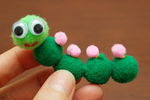 a.) CATERPILLAR - glue several small pompoms together. Add a pair of wiggle eyes. Draw a mouth with puffy paint or glue a short string to make a smiling mouth.