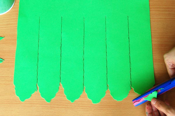 To make the leaves, prepare a 9" x 12" sheet of craft foam. Draw 5 evenly-spaced lines along the length of the foam sheet. Allow for a 2-inch margin at the top of each line. Cut along the lines.