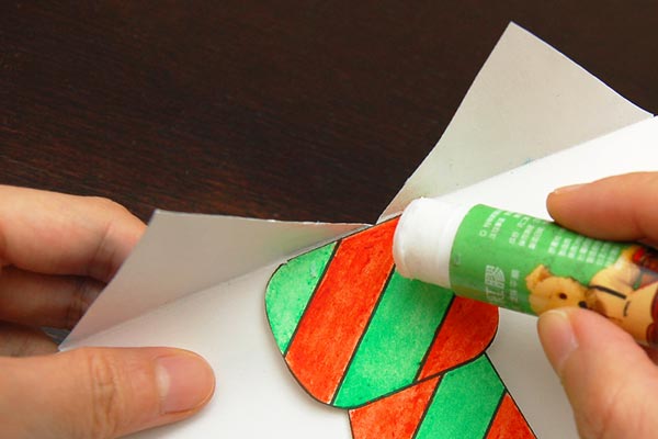 Next, unfold the triangles on the collar. Glue the collar's tab at the back of the greeting card. When doing this, align the dashed line at the base of the triangles with the top edge of the greeting card. Align the tab's right and left sides with the creased edges of the greeting card's flaps.