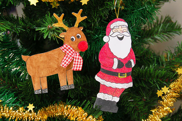 Make some cute Christmas characters to decorate your tree. Print, color, and cut out these Santas and reindeer. Add texture by accenting with materials such as a small pompom for the reindeer's nose, a ribbon to tie around its neck, and cotton for Santa's beard.